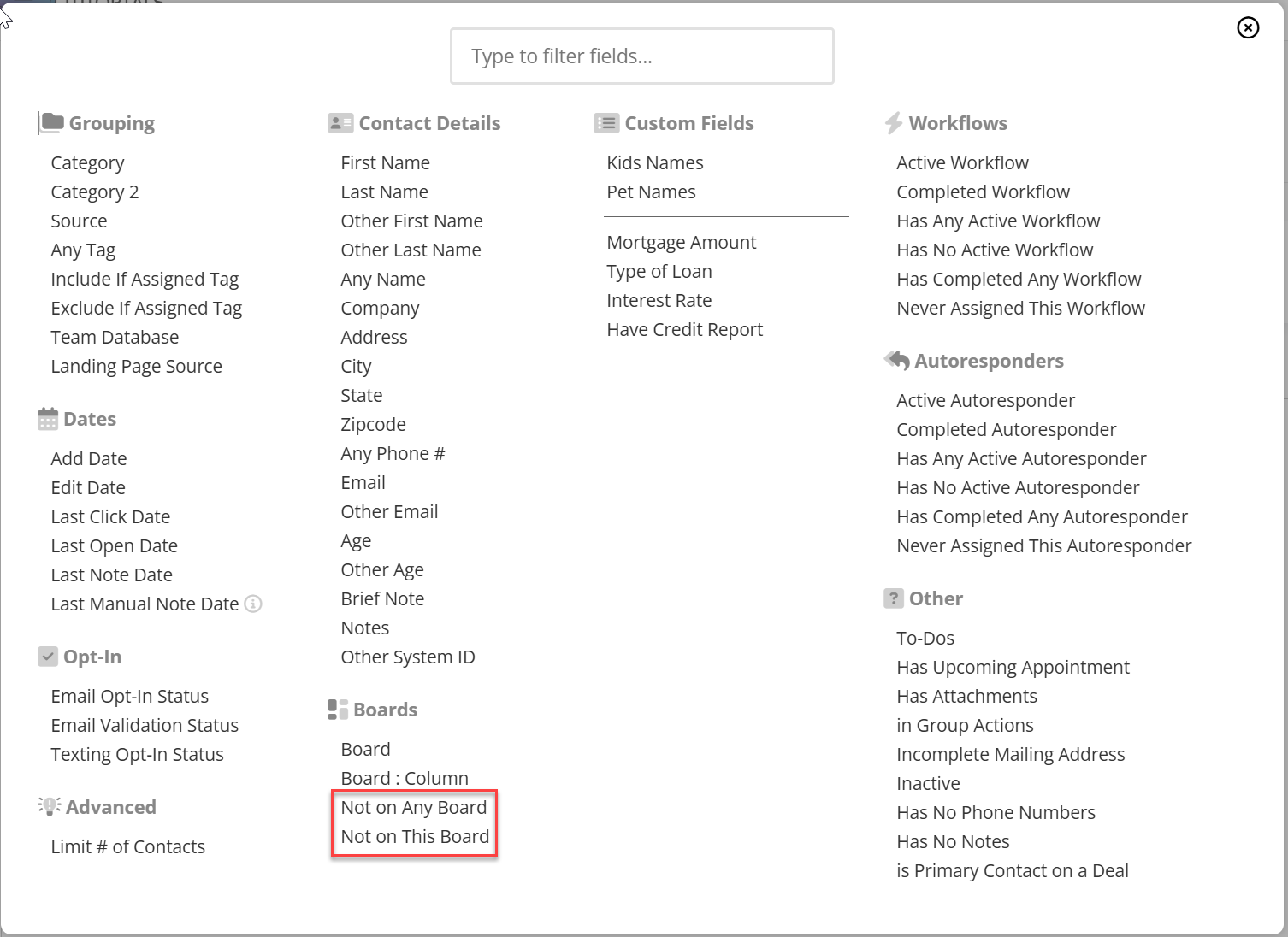 We’ve introduced two new Advanced Search filters to help you manage your pipeline more effectively. You can now specifically search for contacts who are not assigned to any Board, or filter for contacts not on a specific Board, ensuring no lead falls through the cracks.