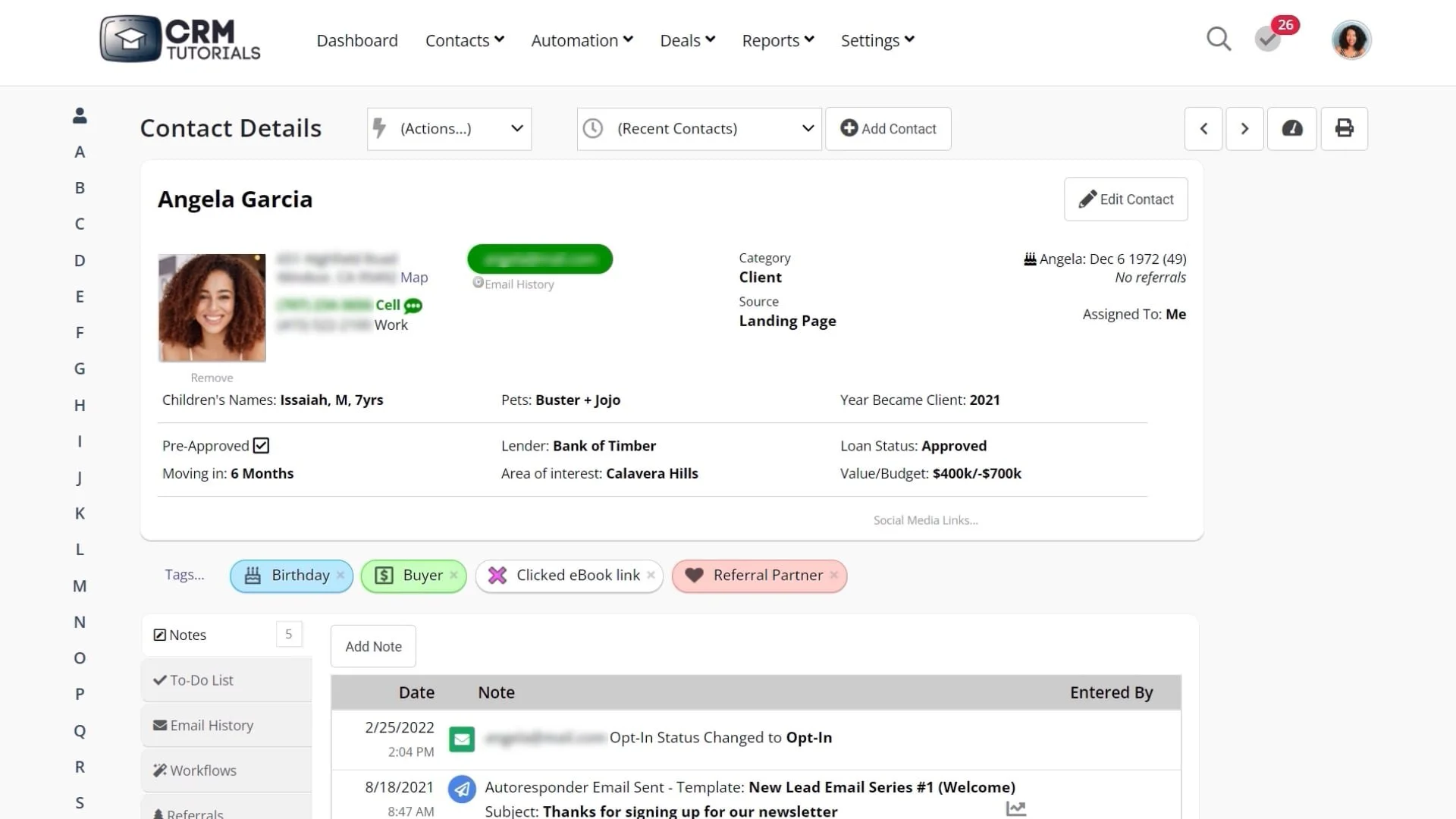 You have several tabs with additional information about this contact. Here you will find Notes, to-dos, attachments, referrals, and more.
