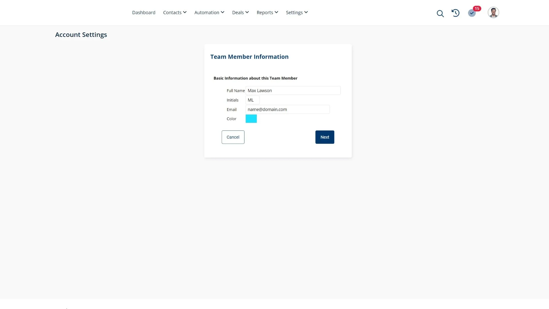 Here you will fill out basic information: name, initials, email, and the color that will represent this team member.