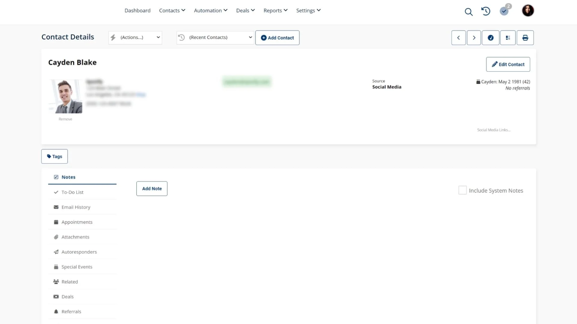 The notes section will also include system notes, like when emails were sent to this contact, and when the contact completed a landing page form.