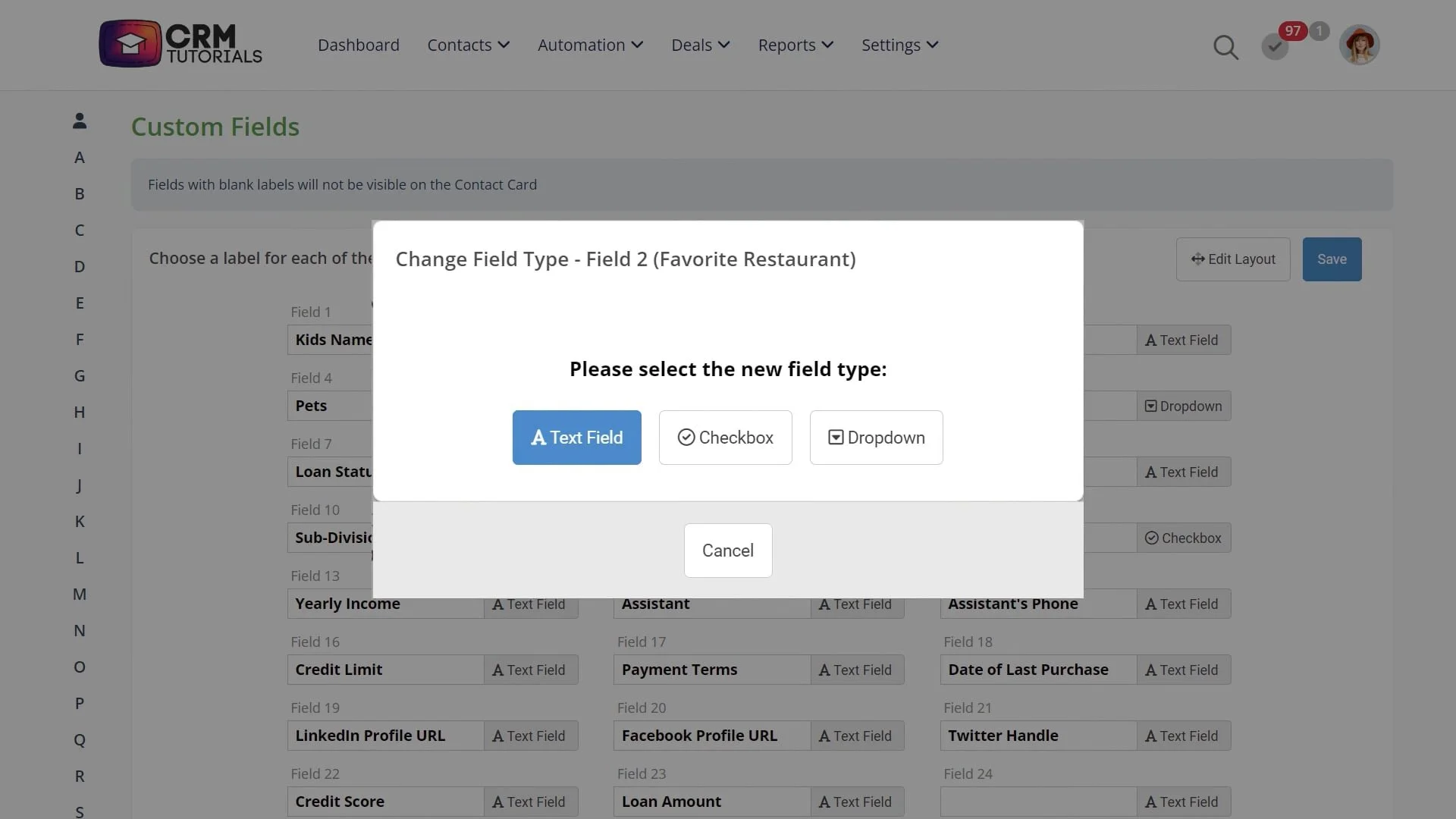 If we wanted a field that had a drop down, for example, to indicate a subdivision, you would select dropdown from the field type and then just list what you want to appear in the drop down like this.Sometimes we’ll want custom fields to appear in a specific order on the contact card. You can edit the layout here.
